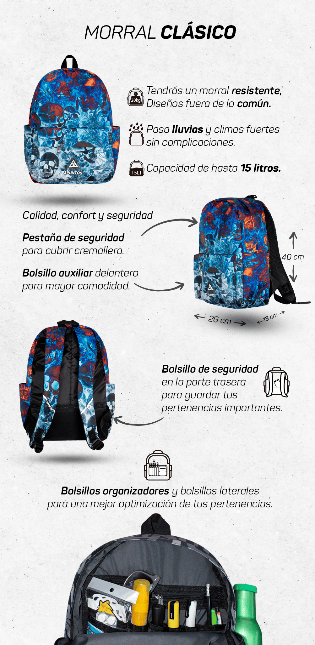Este morral clásico, confeccionado en lona resistente al agua y meticulosamente diseñado para sobresalir, será tu aliado perfecto. No volverás a preocuparte por la falta de espacio, ya que está equipado con una variedad de bolsillos internos organizadores, un conveniente bolsillo adicional en el exterior y un compartimento secreto para proteger tus posesiones más valiosas.